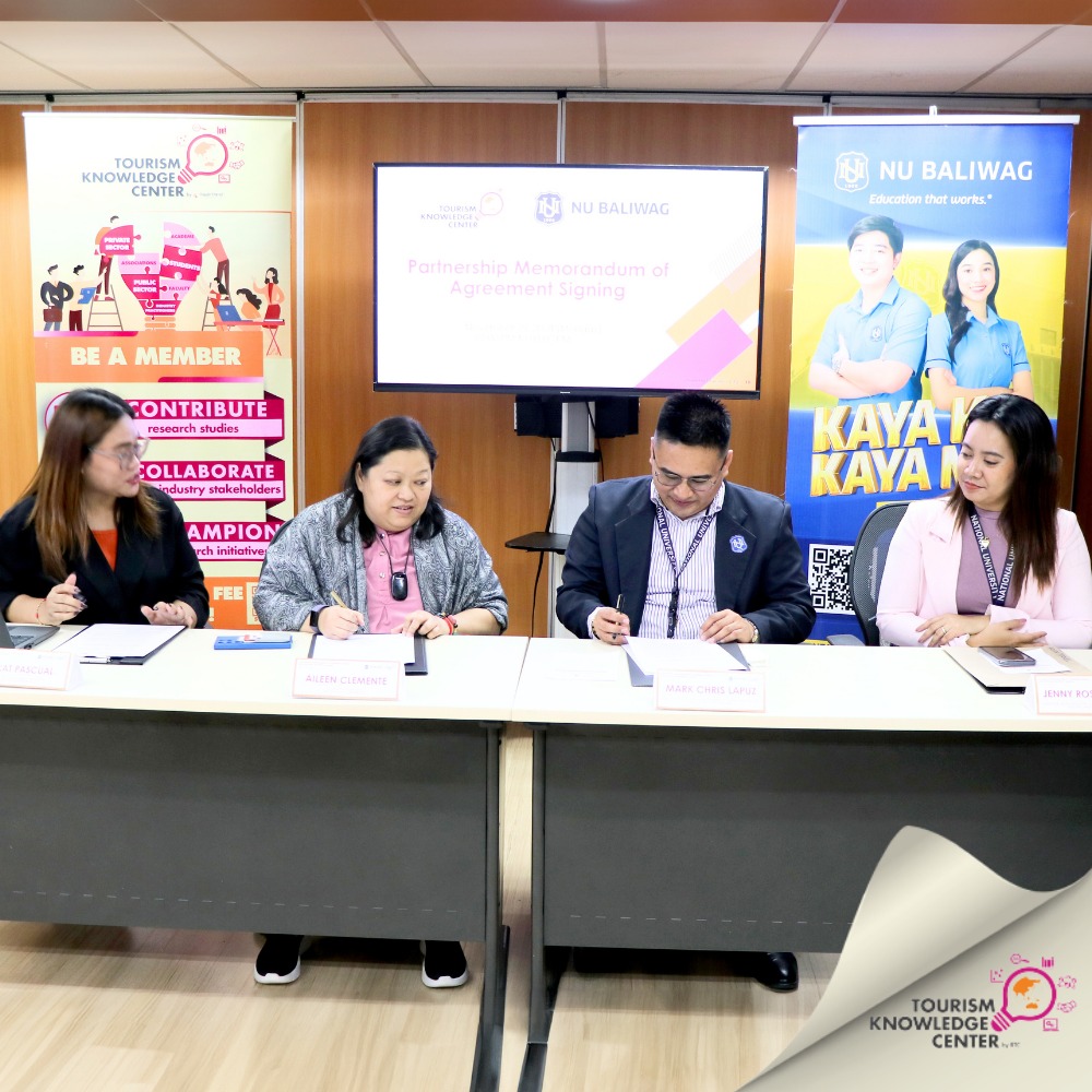 In the photo: Rajah Travel Chairman & President - Ms. Aileen Clemente, NU-Baliwag Dean of School of Tourism & Hospitality Management - Mr. Mark Chris M. Lapuz, NU-Baliwag Academe Industry Linkages and Placement Officer - Ms. Jenny Rose Naval, and TKC Supervisor - Ms. Kitkat Pascual.