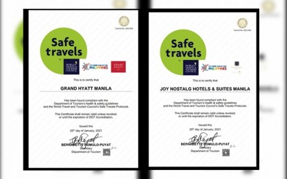 The Department of Tourism (DOT) officially welcomed on Monday Joy Nostalg Hotel & Suites Manila and Grand Hyatt Hotel as the first two recipients of the World Travel and Tourism Council (WTTC) Safe Travels stamp in the country. View