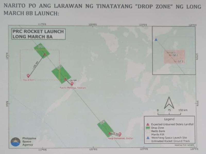 Three drop zones were identified, where parts of the rocket are expected to land. Their approximate distances are: 1. Rozul Reef (Iroquois), one of the contested features in the West Philippine Sea 2. Puerto Princesa, Palawan 3. Hadji Muhtamad, Basilan View
