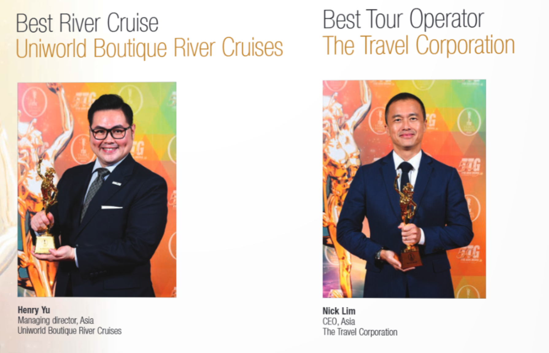 ✅ Most Sustainable Travel Company - The Travel Corporation ✅ Best River Cruise - Uniworld Boutique River Cruises ✅ Best Tour Operator - The Travel Corporation ✅ Best Cruise Line - Silversea Cruises ✅ Best NTO - Tourism Promotion Board Philippines ✅ Best Airport Lounge Operator - Singapore Airlines ✅ Best Full Service Carrier - Singapore Airlines ✅ Best Airline - Business Class - Qatar Airways ✅ Best Low-Cost Carrier - Scoot View
