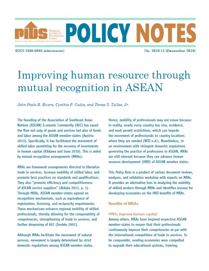Mutual recognition arrangements (MRAs) facilitate the movement of skilled labor within the Association of Southeast Asian Nations (ASEAN). This Policy Note reviews these MRAs and provides an alternative lens in analyzing the mobility of skilled workers in ASEAN. Among others, it finds that while MRAs have inspired continuous improvement of professional competencies to be at par with the international competition, benchmarking of best practices is lacking. Mobility of professionals, in reality, may not ensue because nearly every country has visa, residence, and work permit restrictions, which can impede the movement of professionals to country locations where they are needed. There is hesitation among ASEAN member-states to give up their domestic regulation and nationally defined standards toward accrediting and licensing professionals. Hence, there is a need to reform domestic regulations to liberalize highly restrictive professions. For ASEAN to realize free trade in services, member-states are urged to harmonize their regulatory frameworks in order to have convergence of regulations, establish a harmonized and streamlined process of identifying the training needs and addressing the competency gaps of professionals, and promote a multistakeholder approach to curriculum design and quality control.